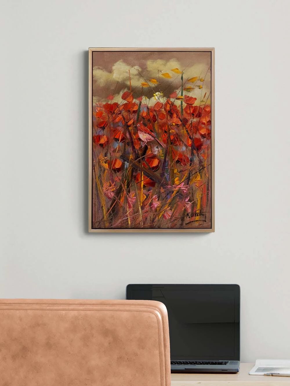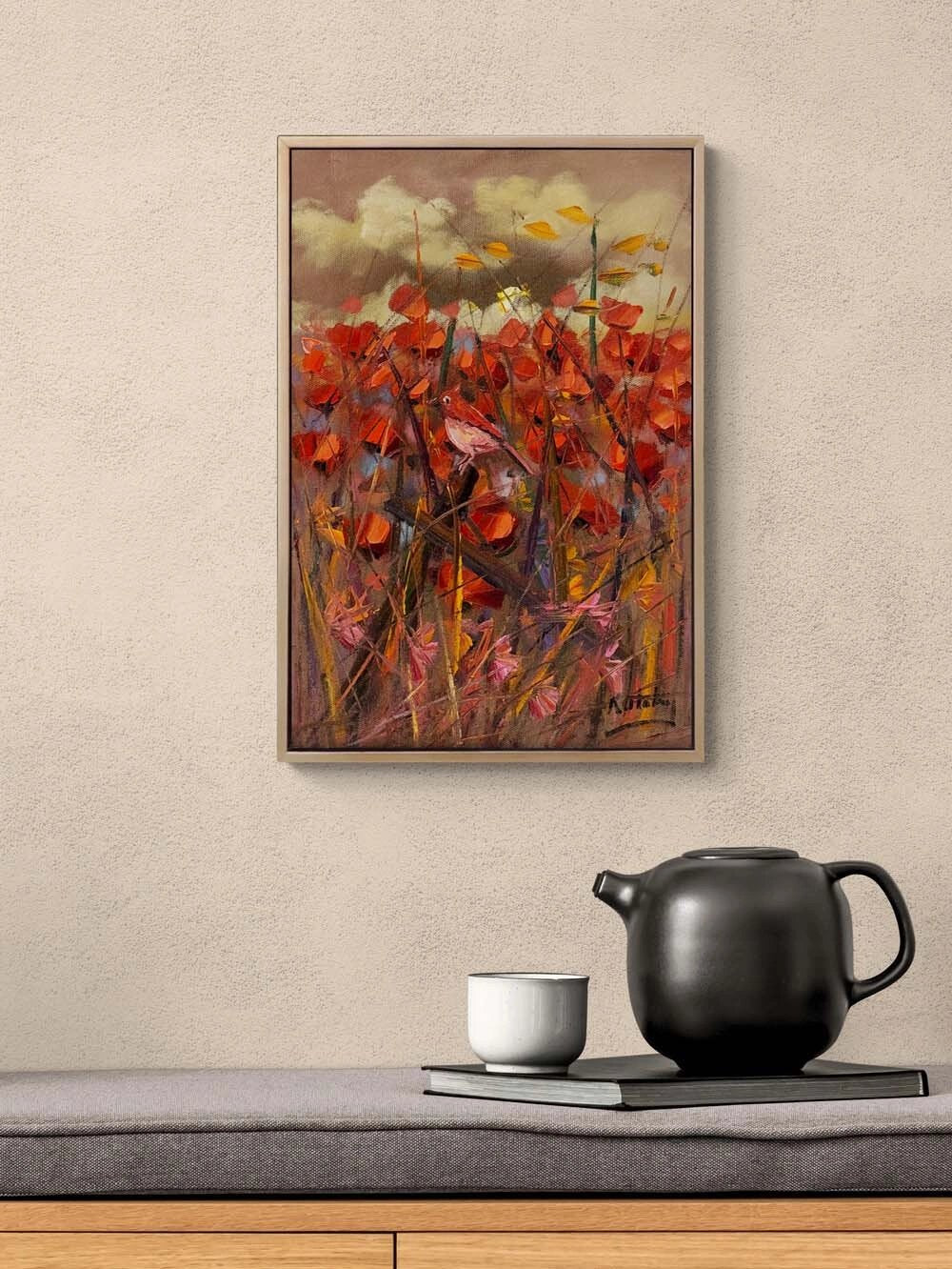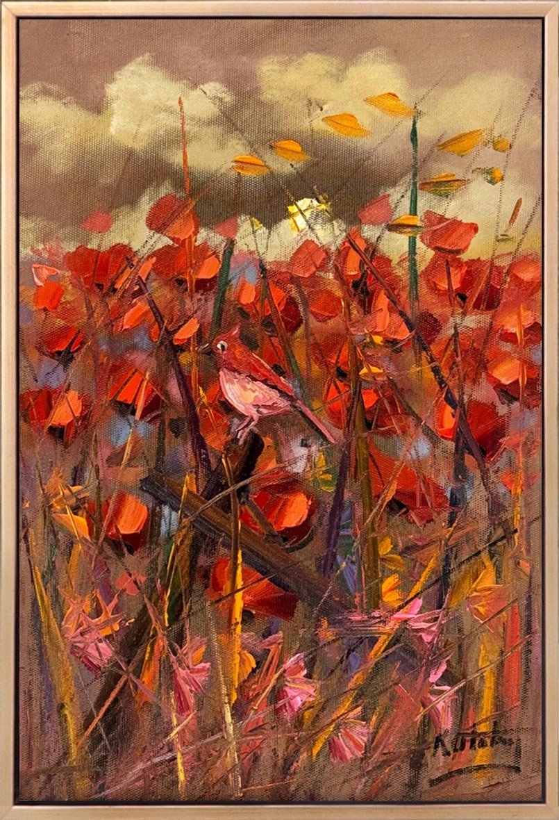 Kırmızıya Konan Kuş Yağlı Boya Tablosu