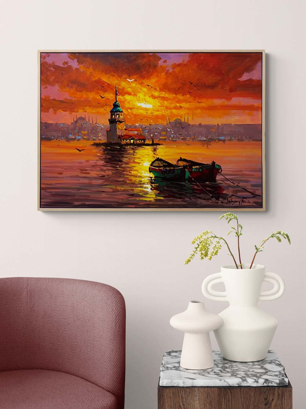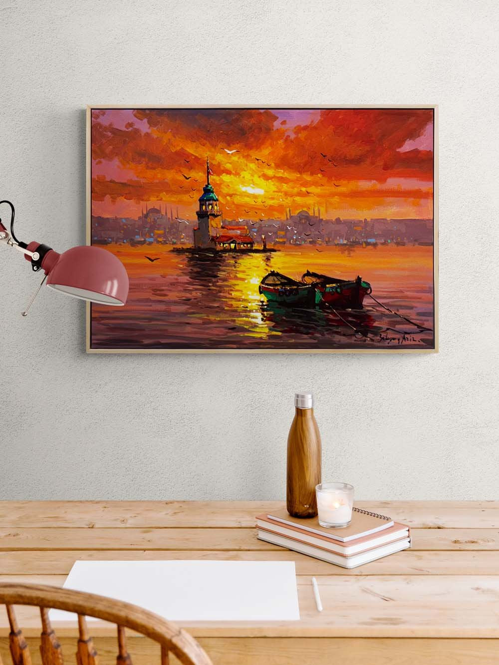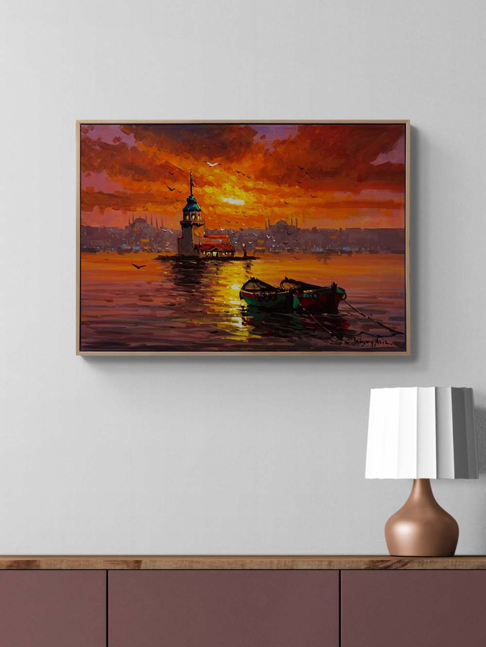 Kız Kulesi'nde Kızıl Gün Yağlı Boya Tablosu