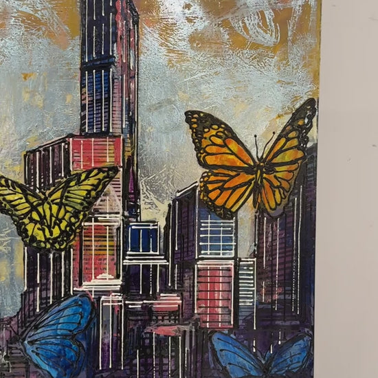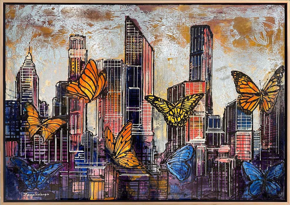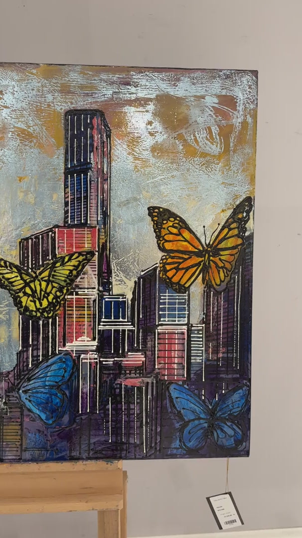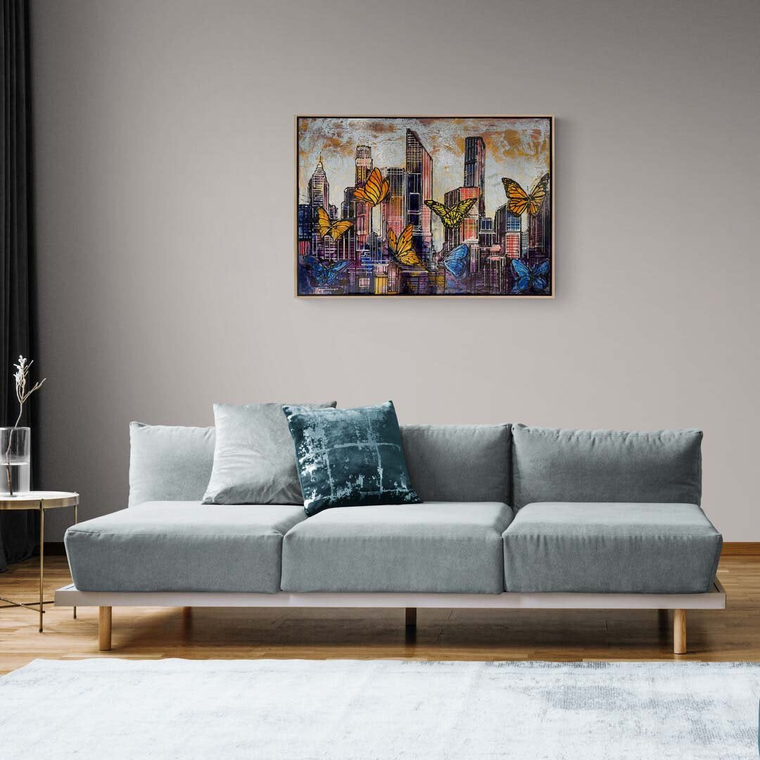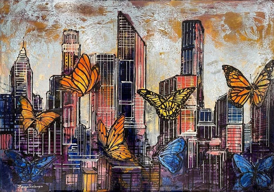 Renkli Kelebekler ve Şehir Yağlı Boya Tablosu