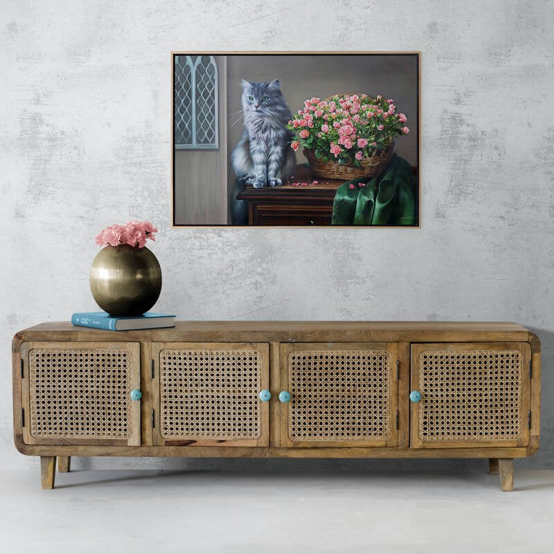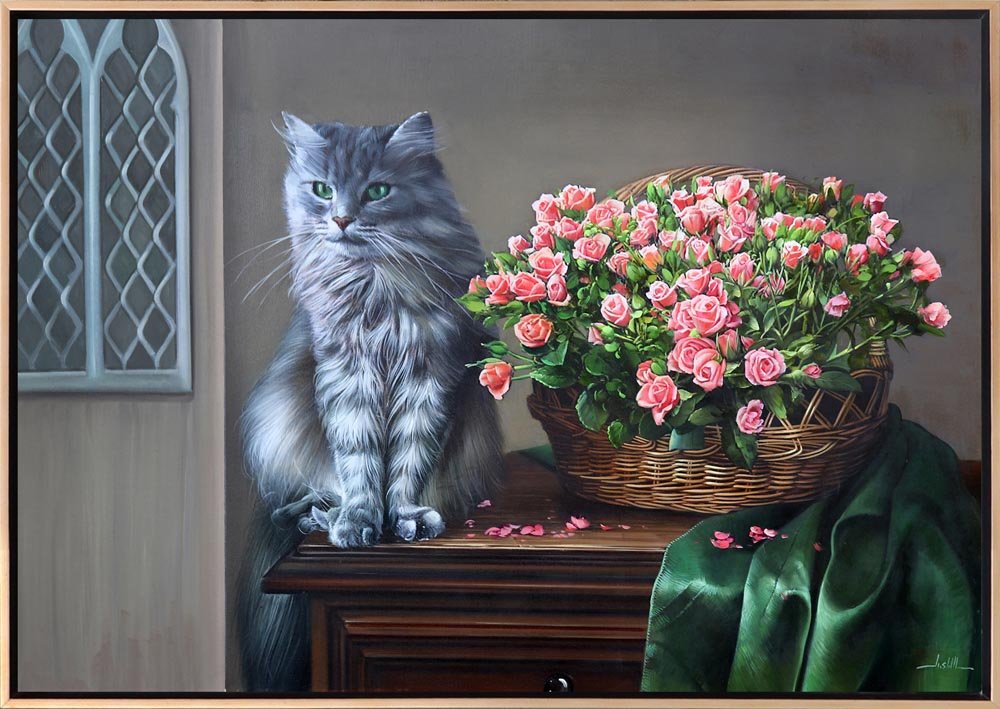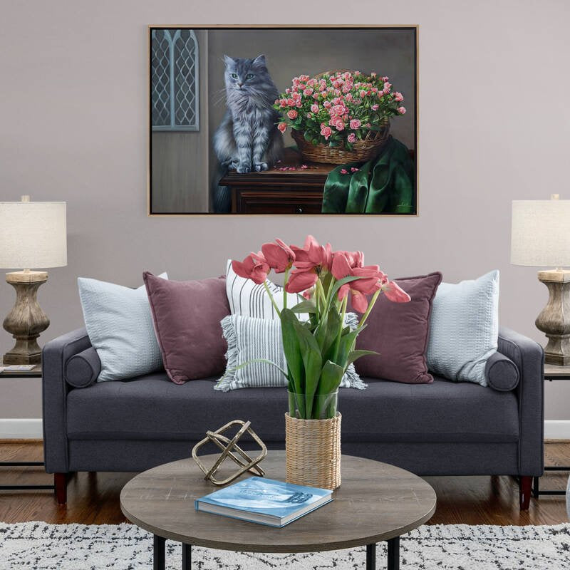 Sepette Pembe Güller ve Kedi Siparişe Özel Yağlı Boya Tablo