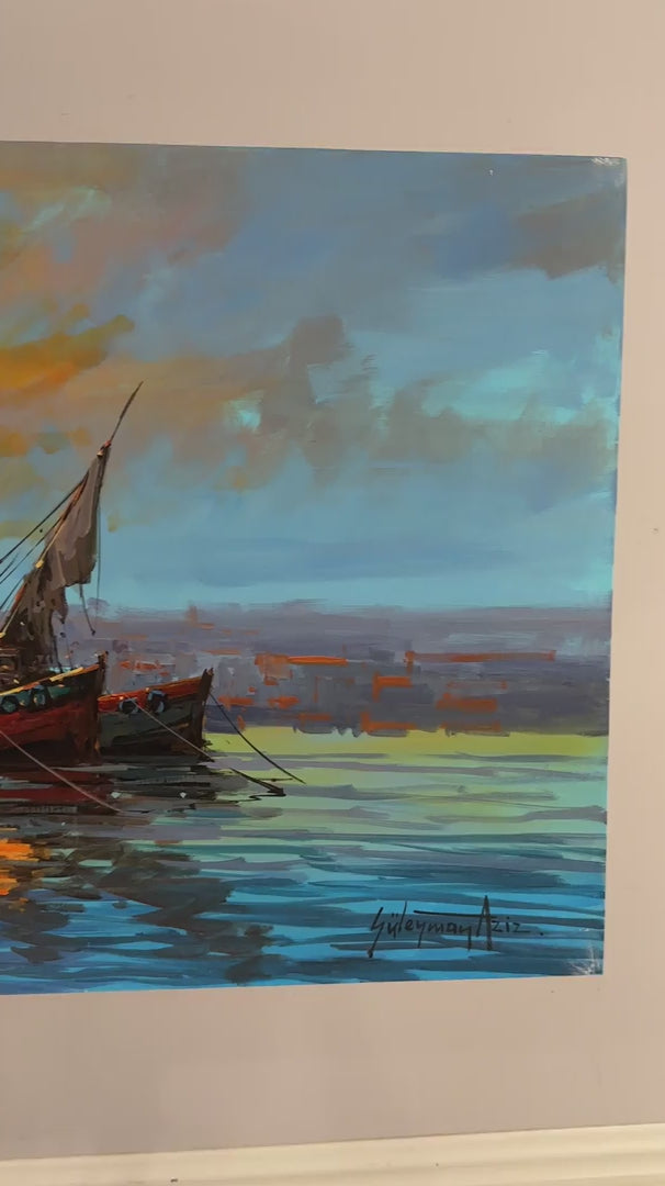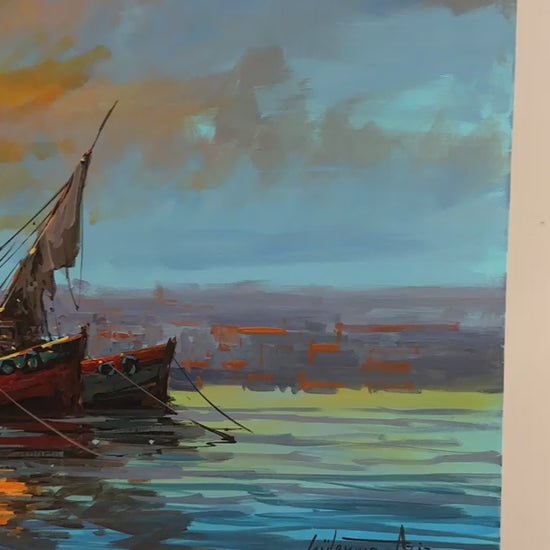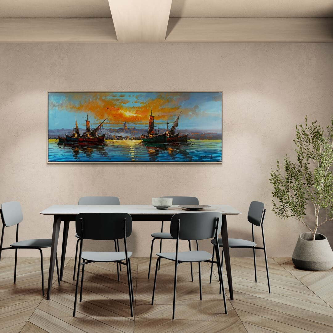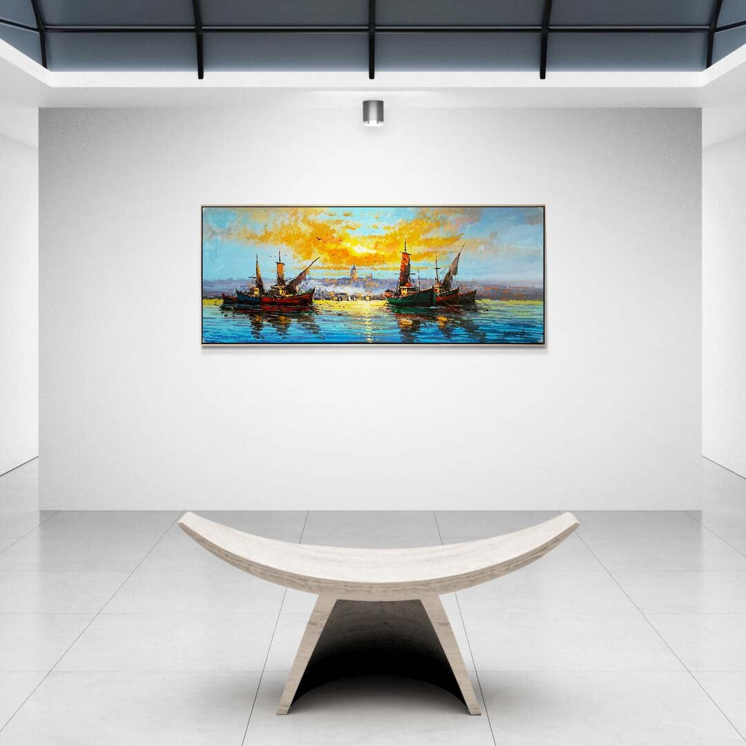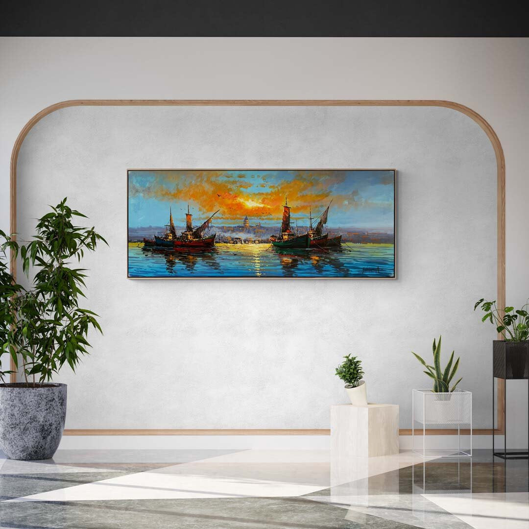 Galata Kulesi'nin Gölgesinde Tekneler Yağlı Boya Tablosu