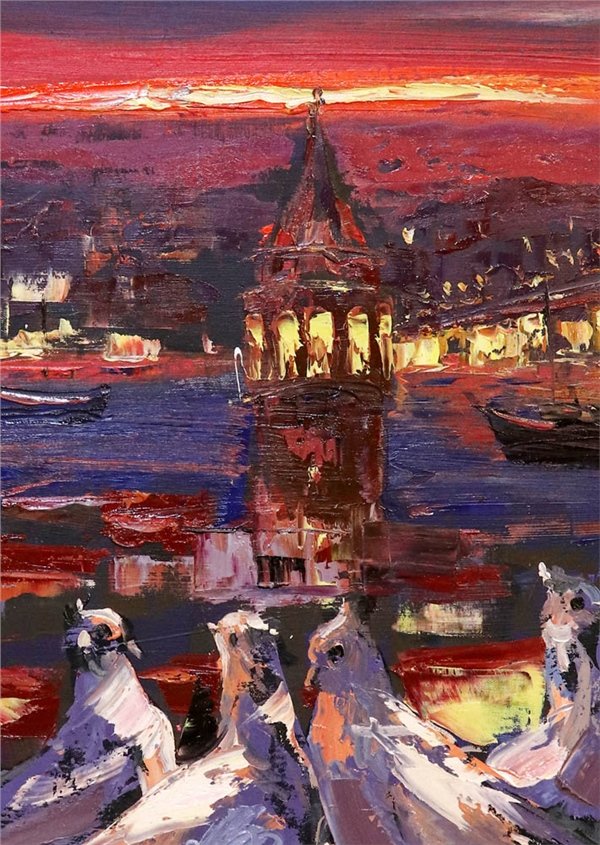 Galata'ya Bakan Kuşlar Yağlı Boya Tablosu
