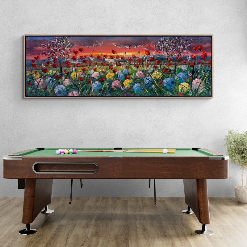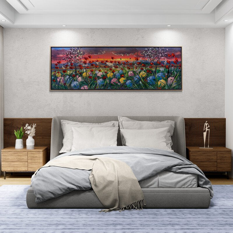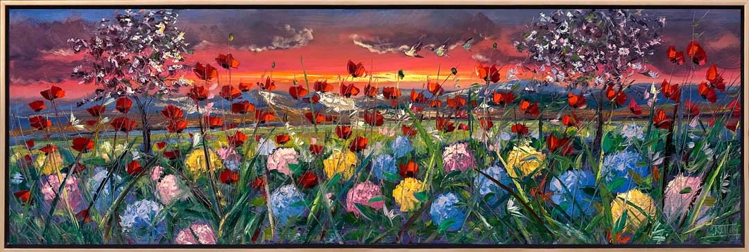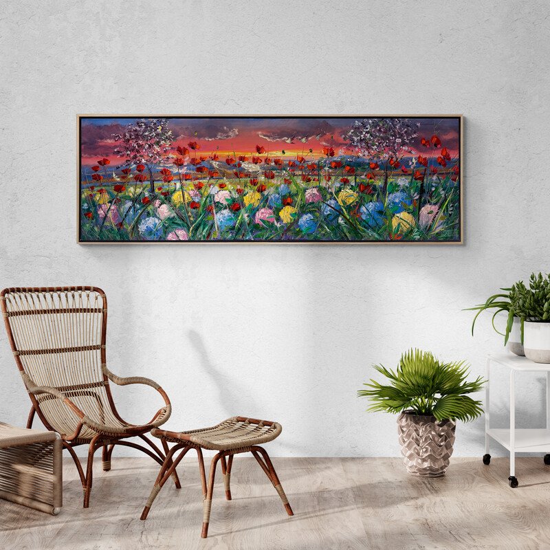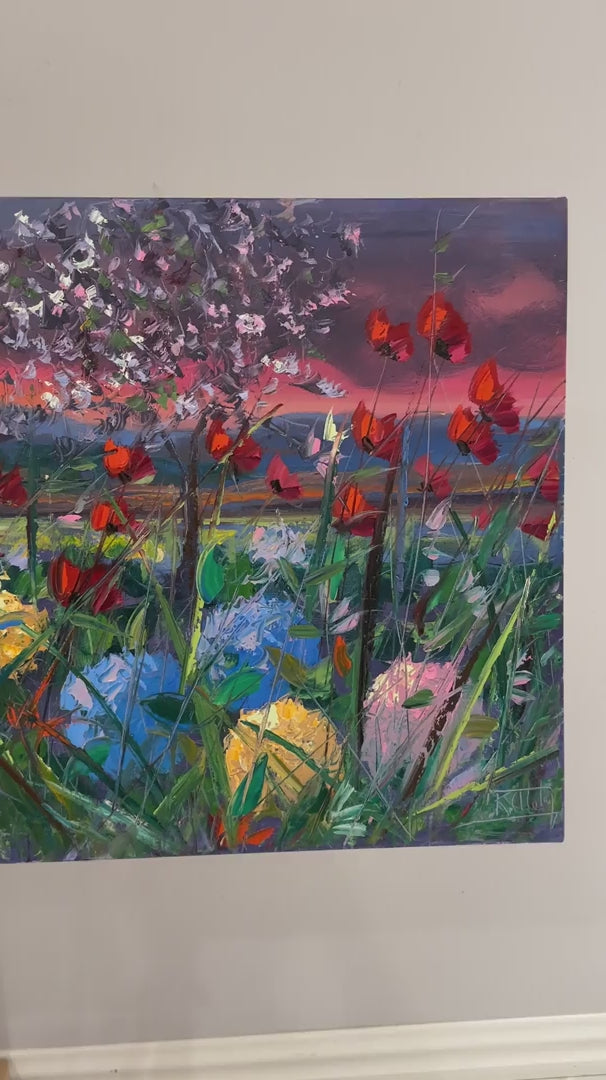 Günbatımında Gelincik ve Ortanca Bahçesi Yağlı Boya Tablosu