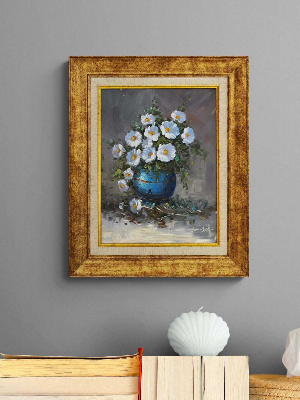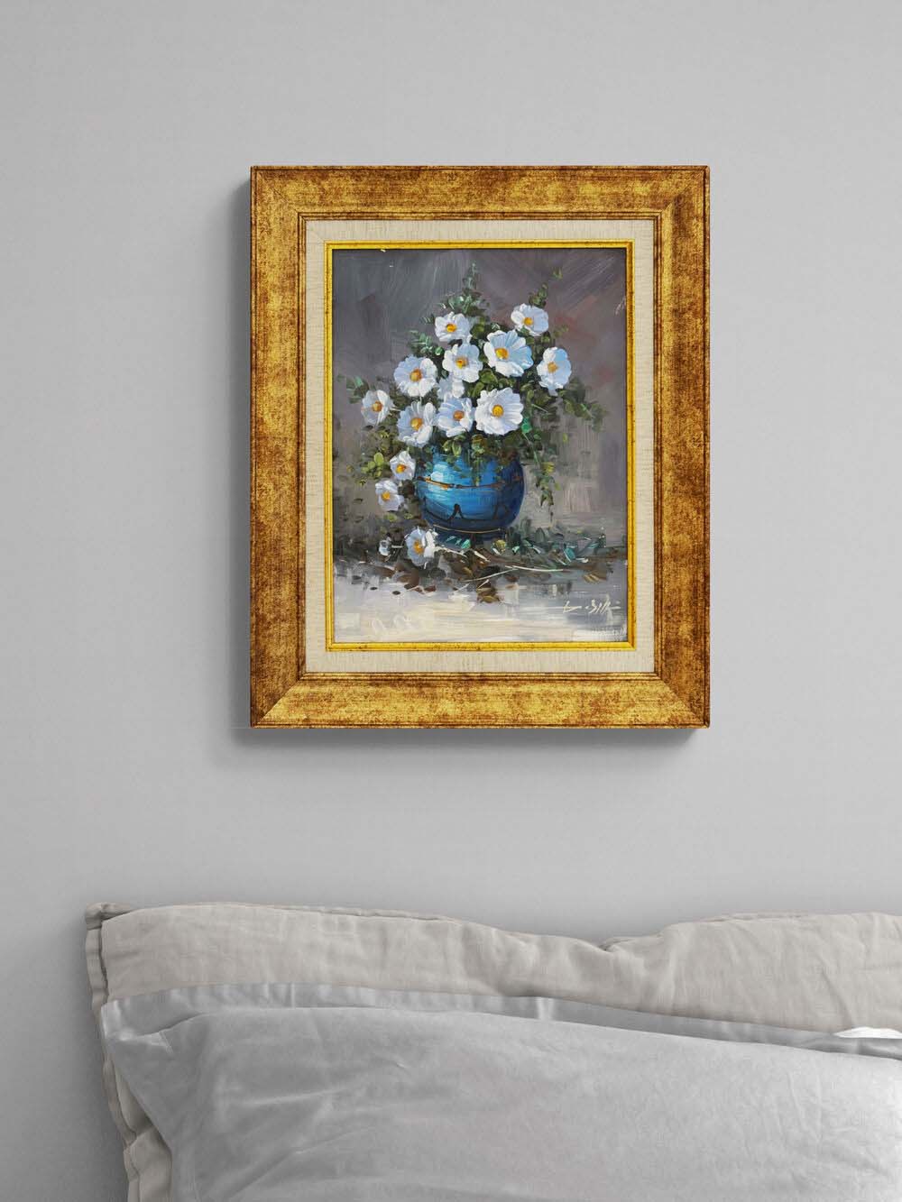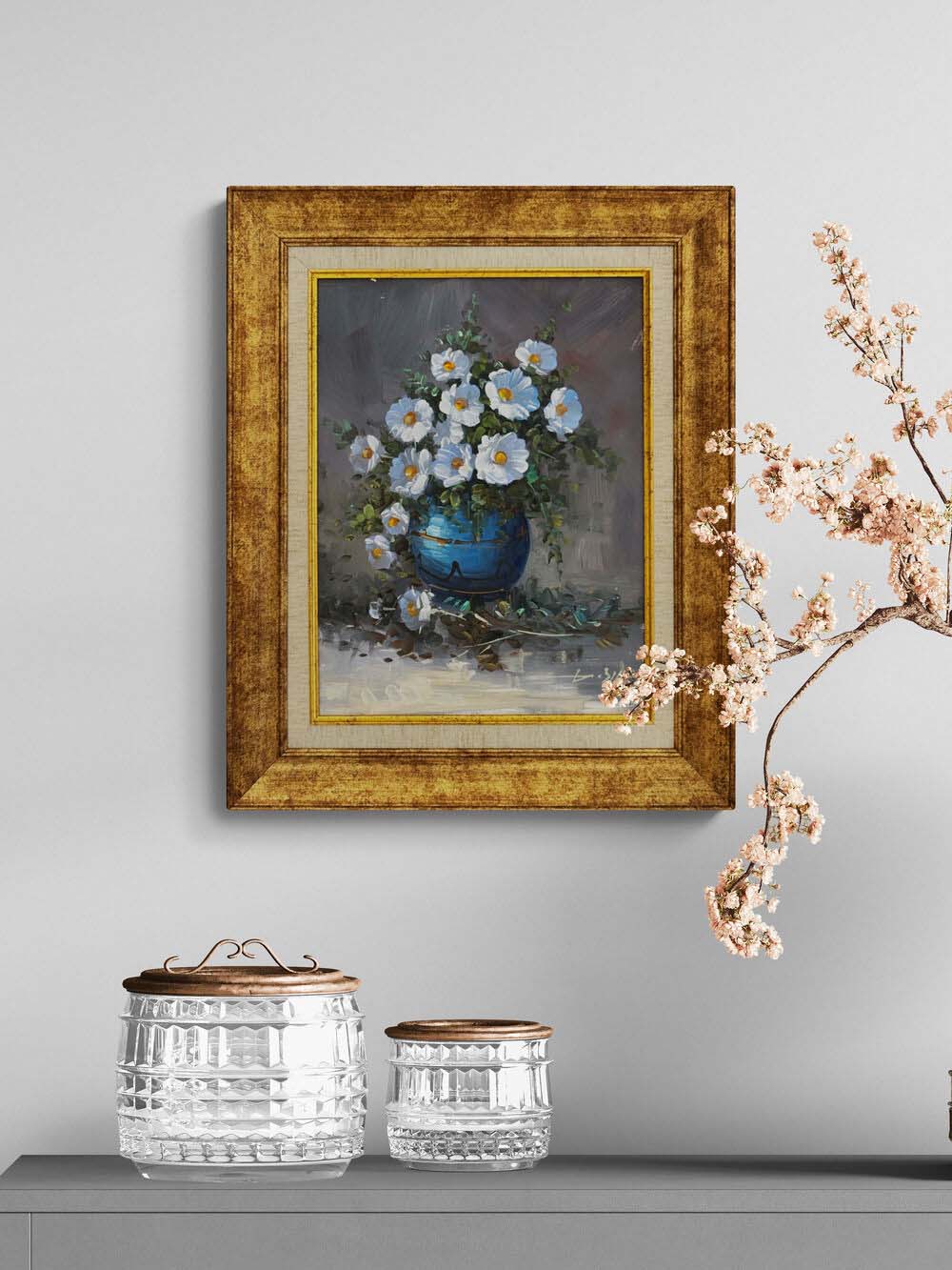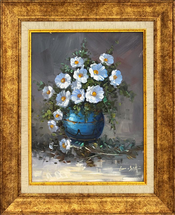Mavi Vazoda Beyaz Düşler Yağlı Boya Tablosu