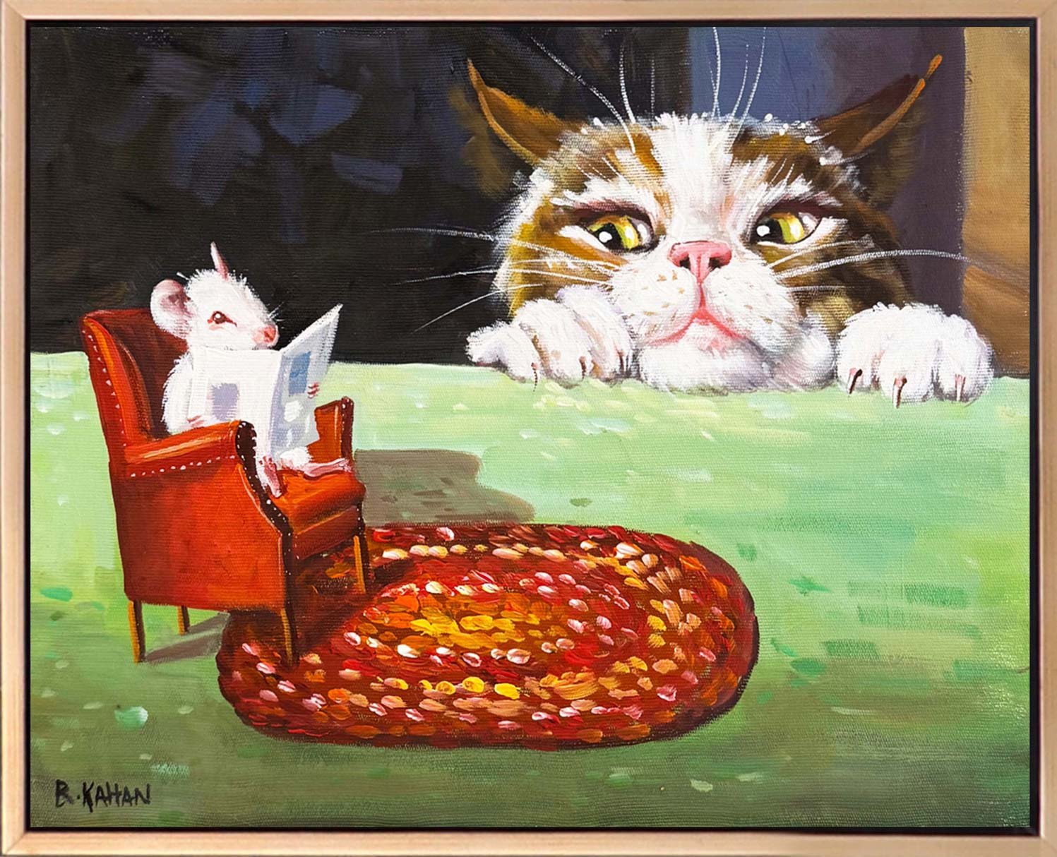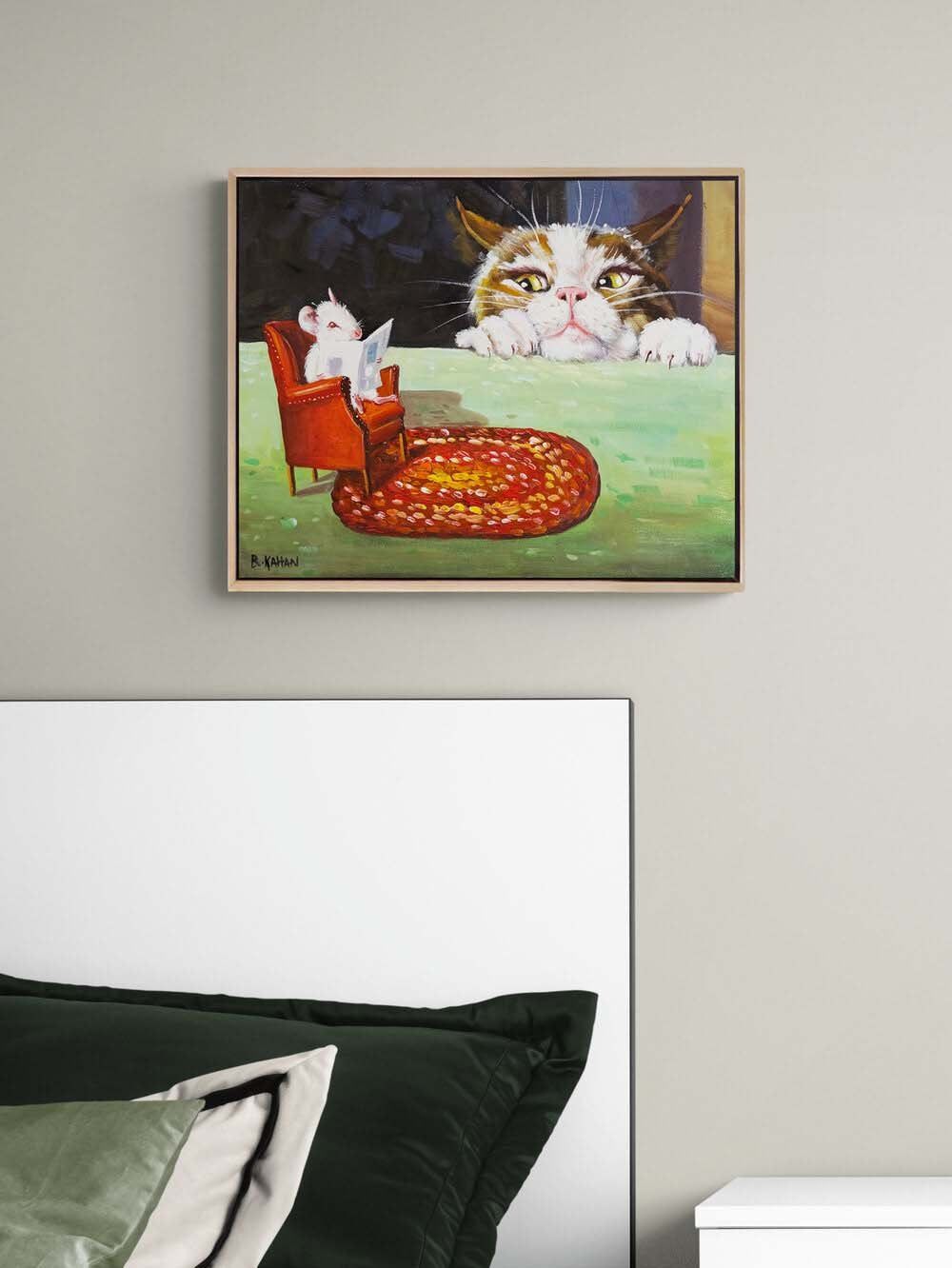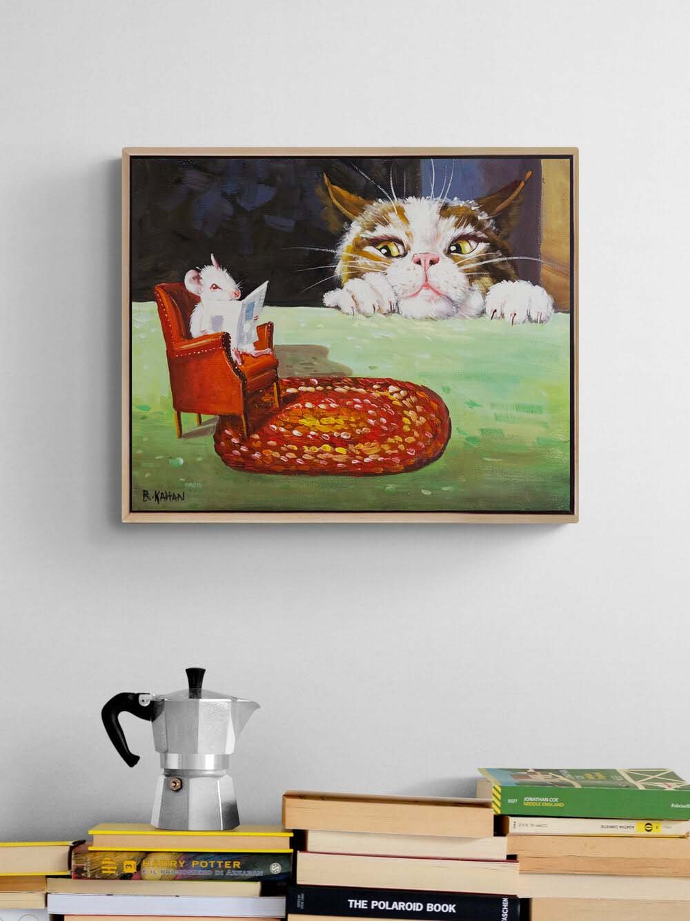 Okuyan Fare Bakan Kedi Yağlı Boya Tablosu