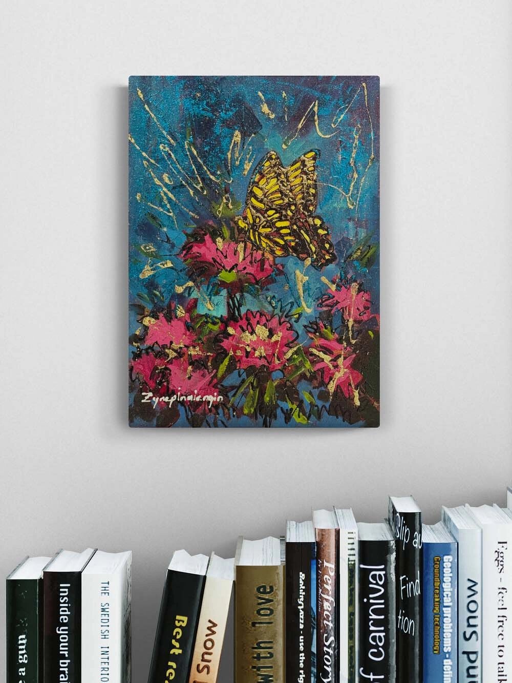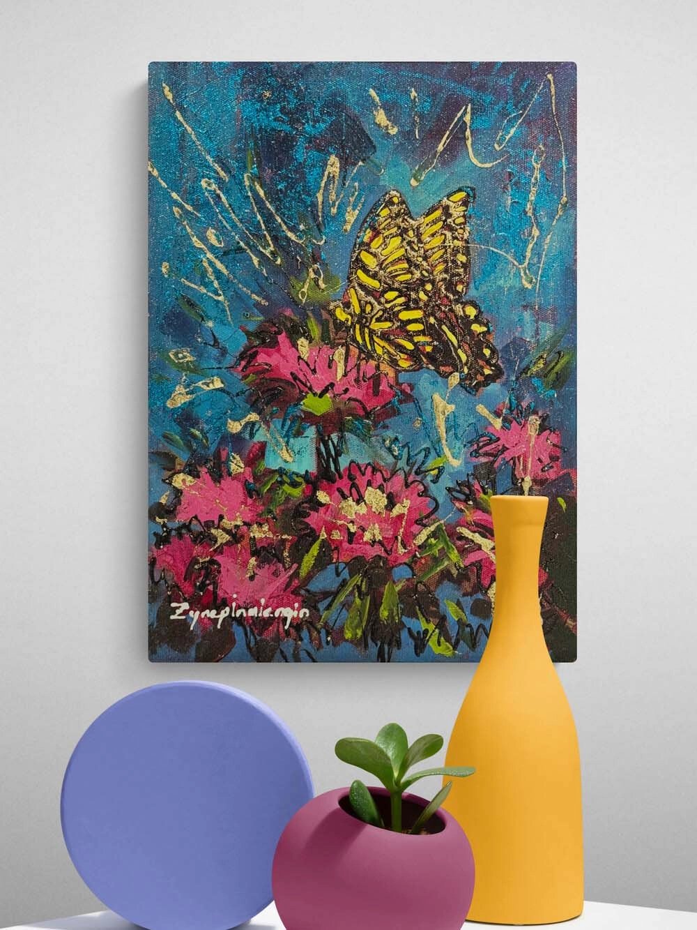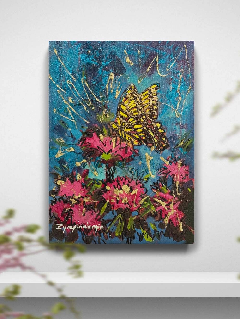 Pembe Çiçeklerde Kelebek Yağlı Boya Tablosu