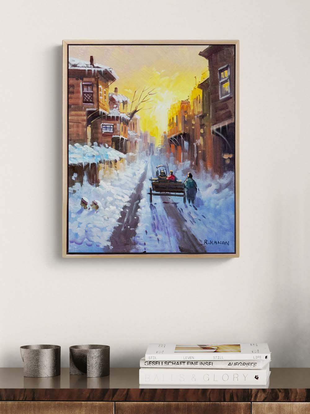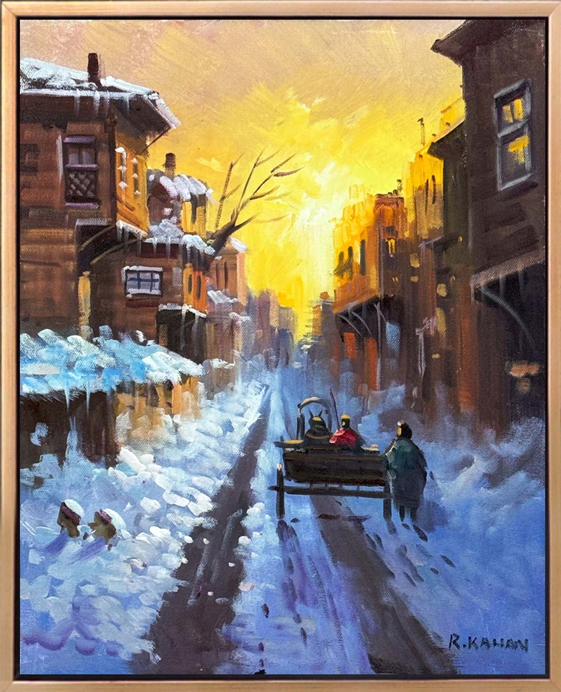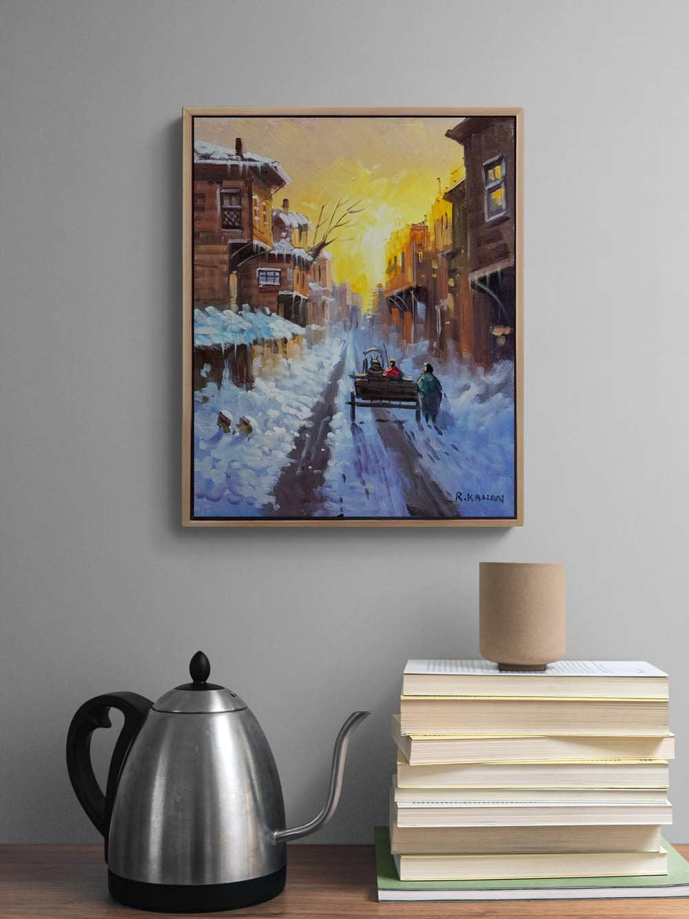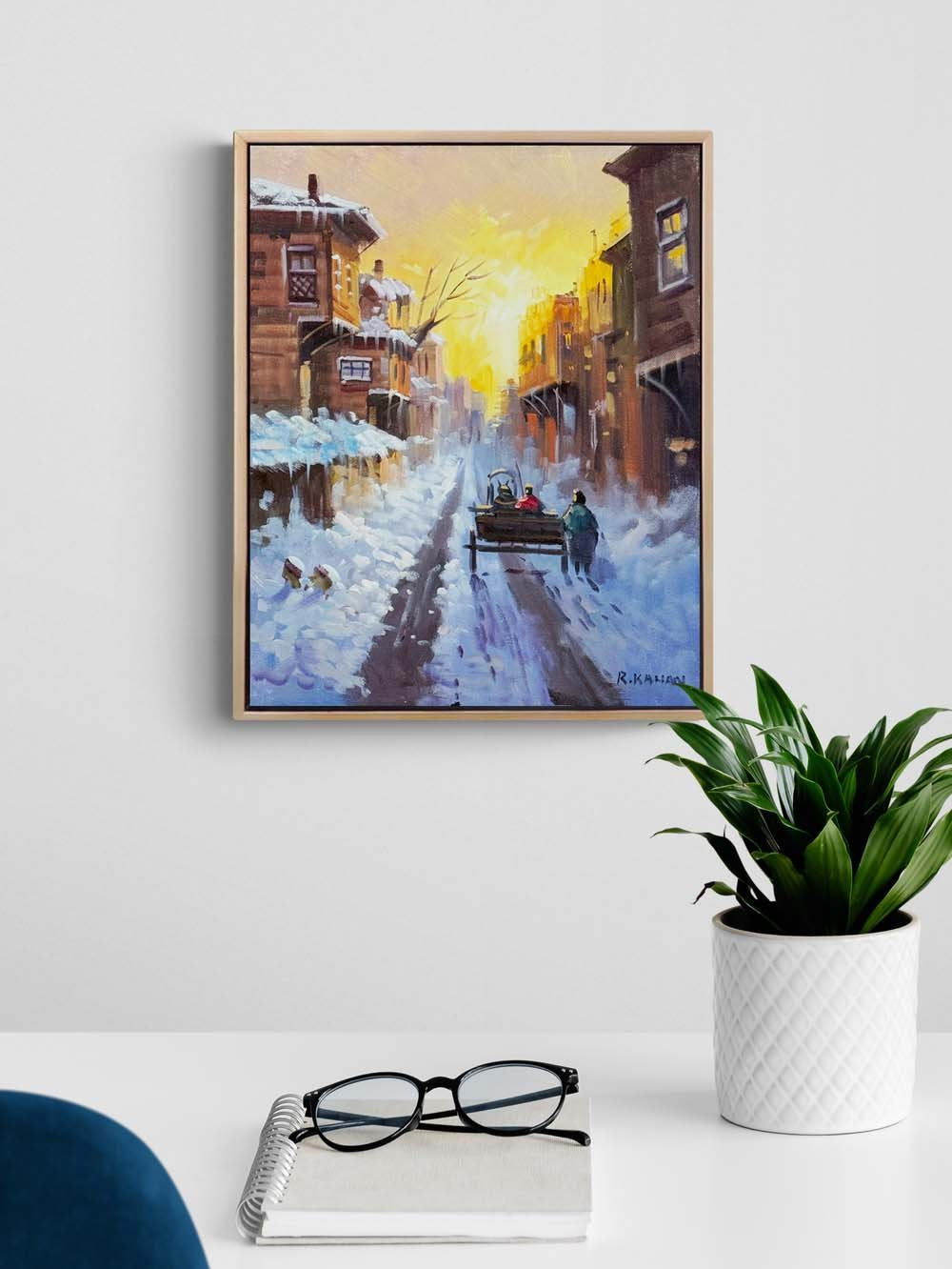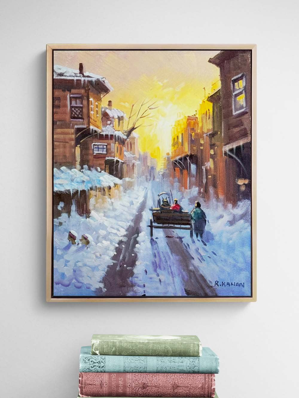 Şehirde Kar Manzarası Yağlı Boya Tablosu