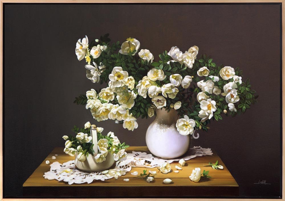 Vazoda Beyaz Güller Siparişe Özel Yağlı Boya Tablo