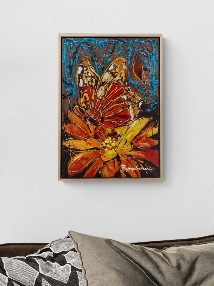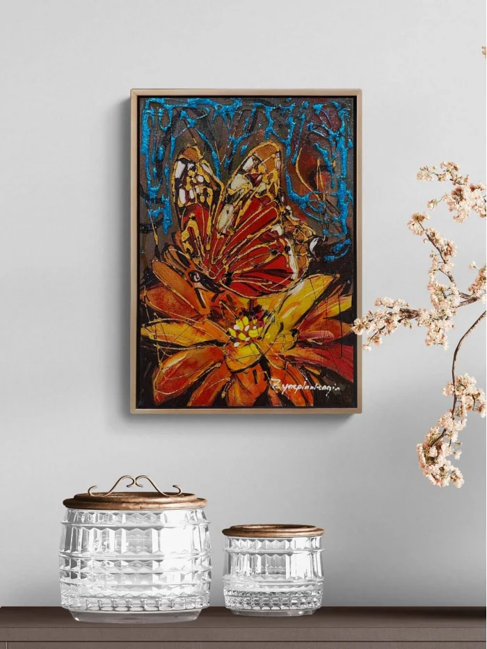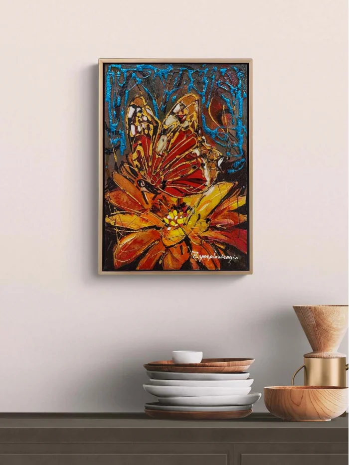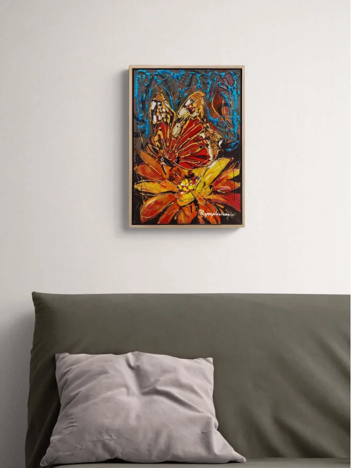 Çiçek Kalbinde Kelebek Yağlı Boya Tablosu