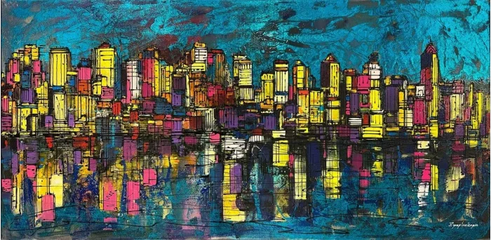The City Silhouette and Reflection Oil Painting