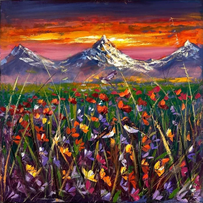 Günbatımında Gelincik Bahçesi Yağlı Boya Tablosu