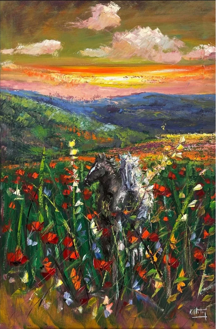 Kır Çiçekleri Arasında Atlar Yağlı Boya Tablosu
